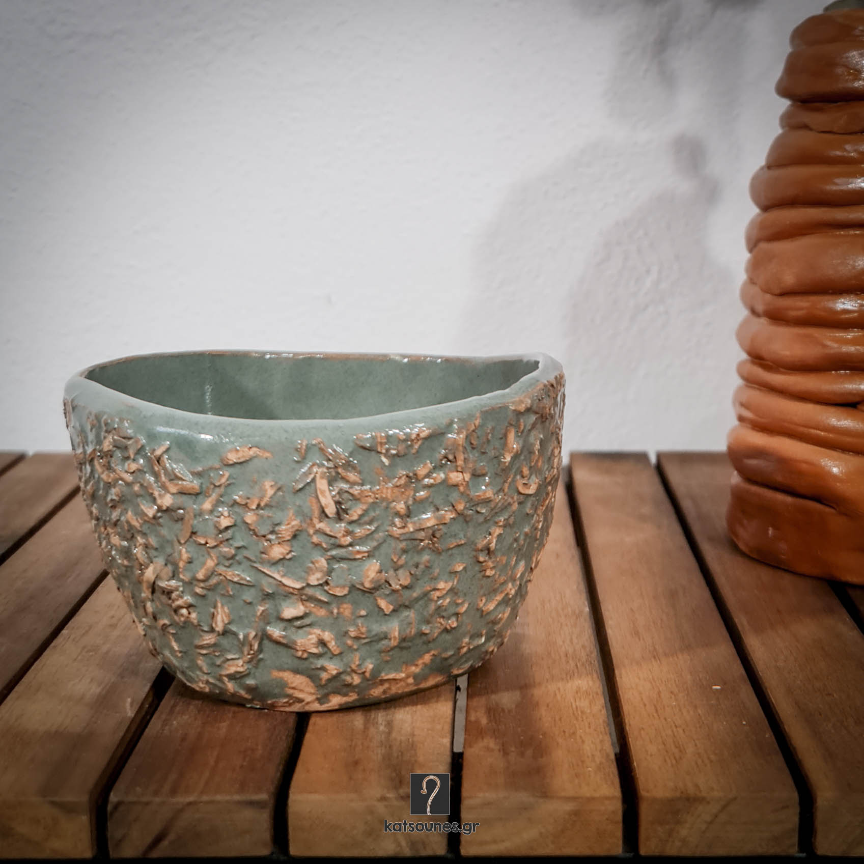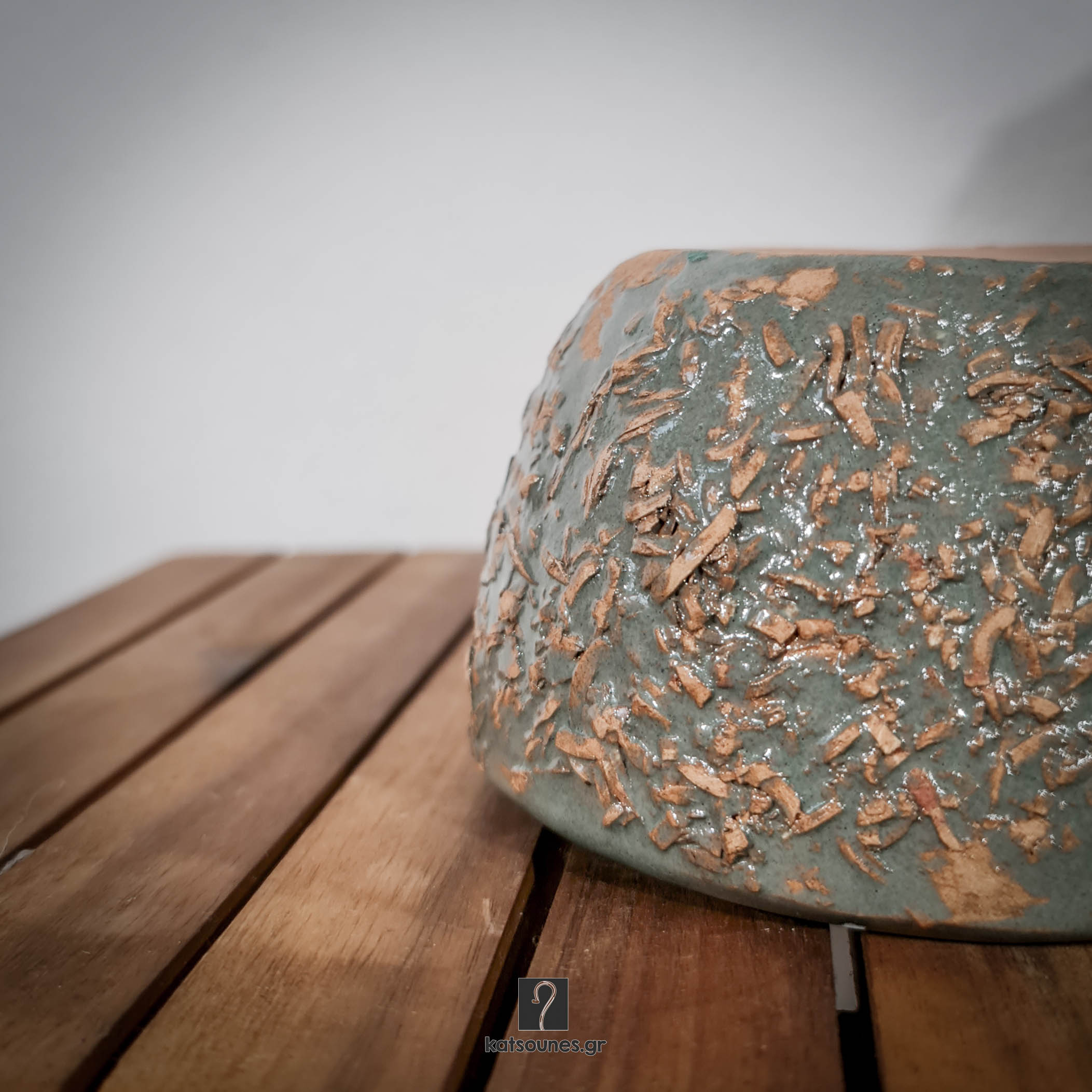 Εντυπωσιακό χειροποίητο κεραμικό σε πράσινο χρώμα με ξύσματα φυσικού πηλού.