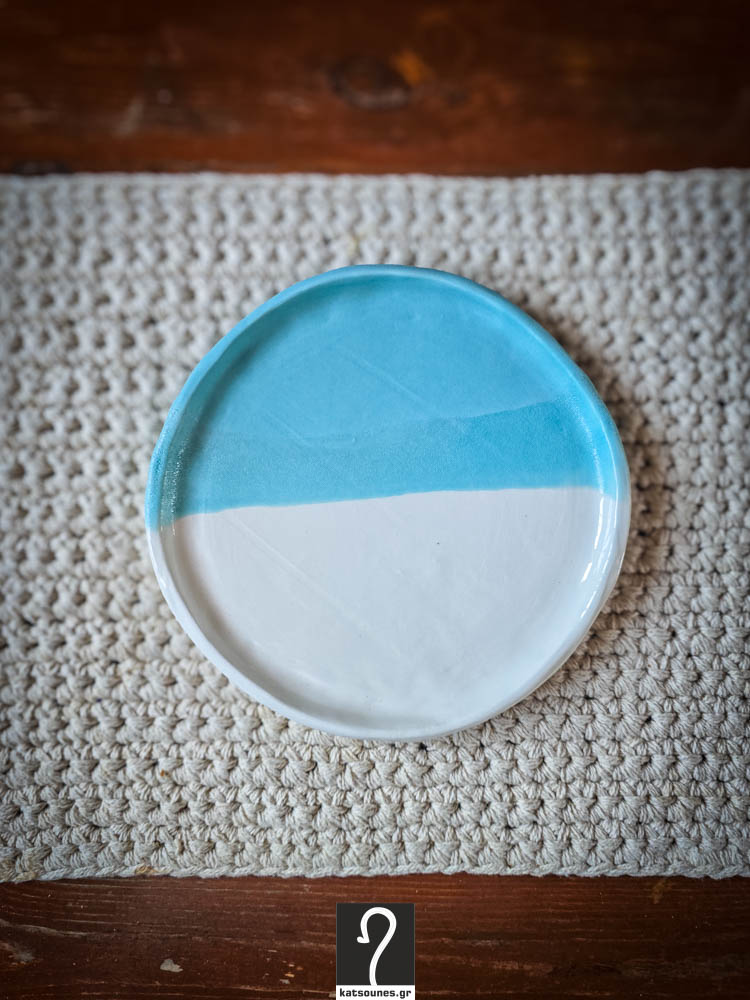 Κάθε πιάτο είναι μοναδικό, φτιαγμένο στο χέρι από λευκή βάση πηλού και διακοσμημένο με ασύμμετρα σχέδια σε αποχρώσεις πράσινου και γαλάζιου. Η φυσική ατέλεια του χειροποίητου αναδεικνύει τον χαρακτήρα και την αυθεντικότητα κάθε δημιουργίας, κάνοντάς το όχι μόνο χρηστικό αντικείμενο αλλά και διακοσμητικό στοιχείο με προσωπικότητα.
