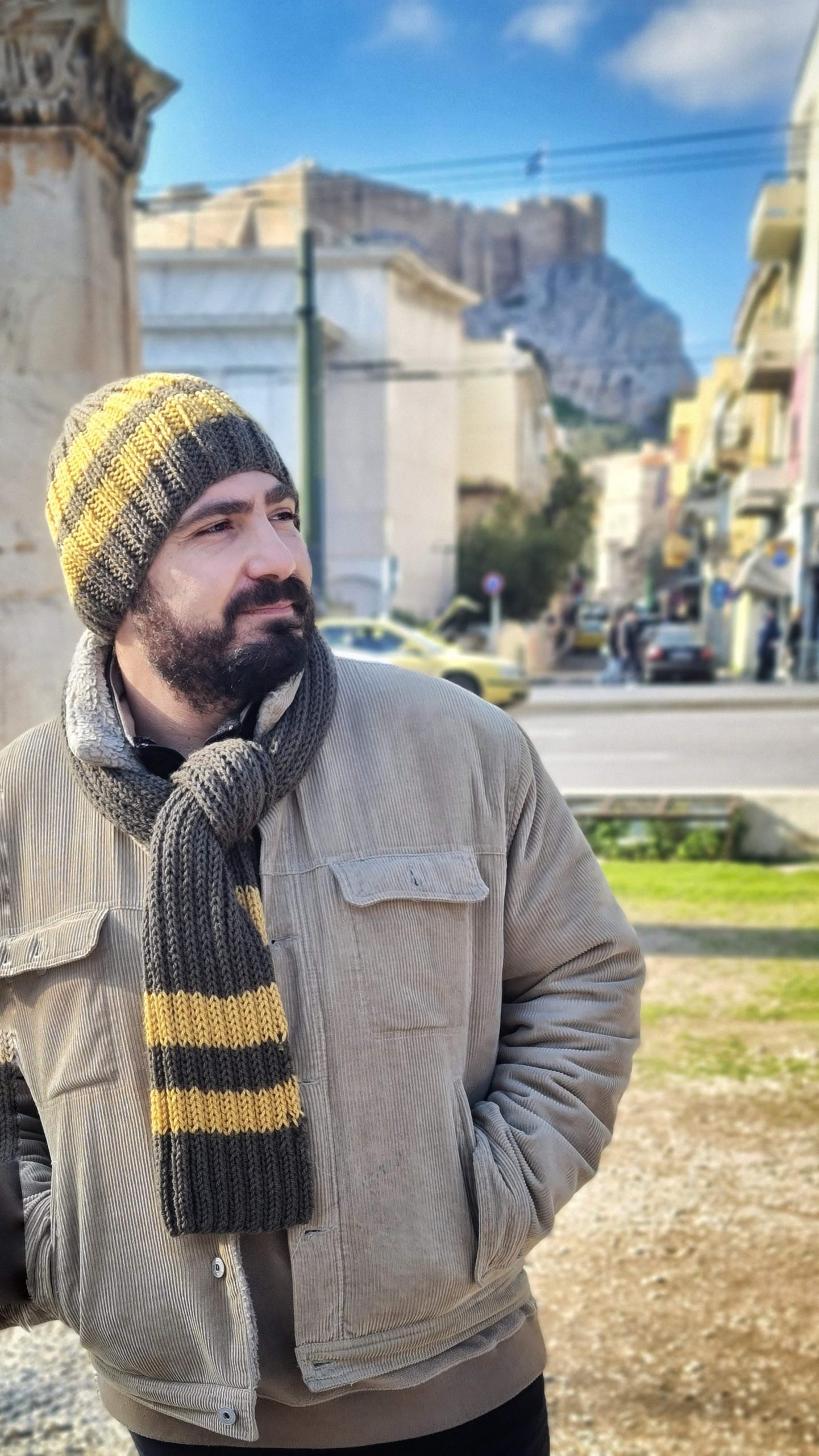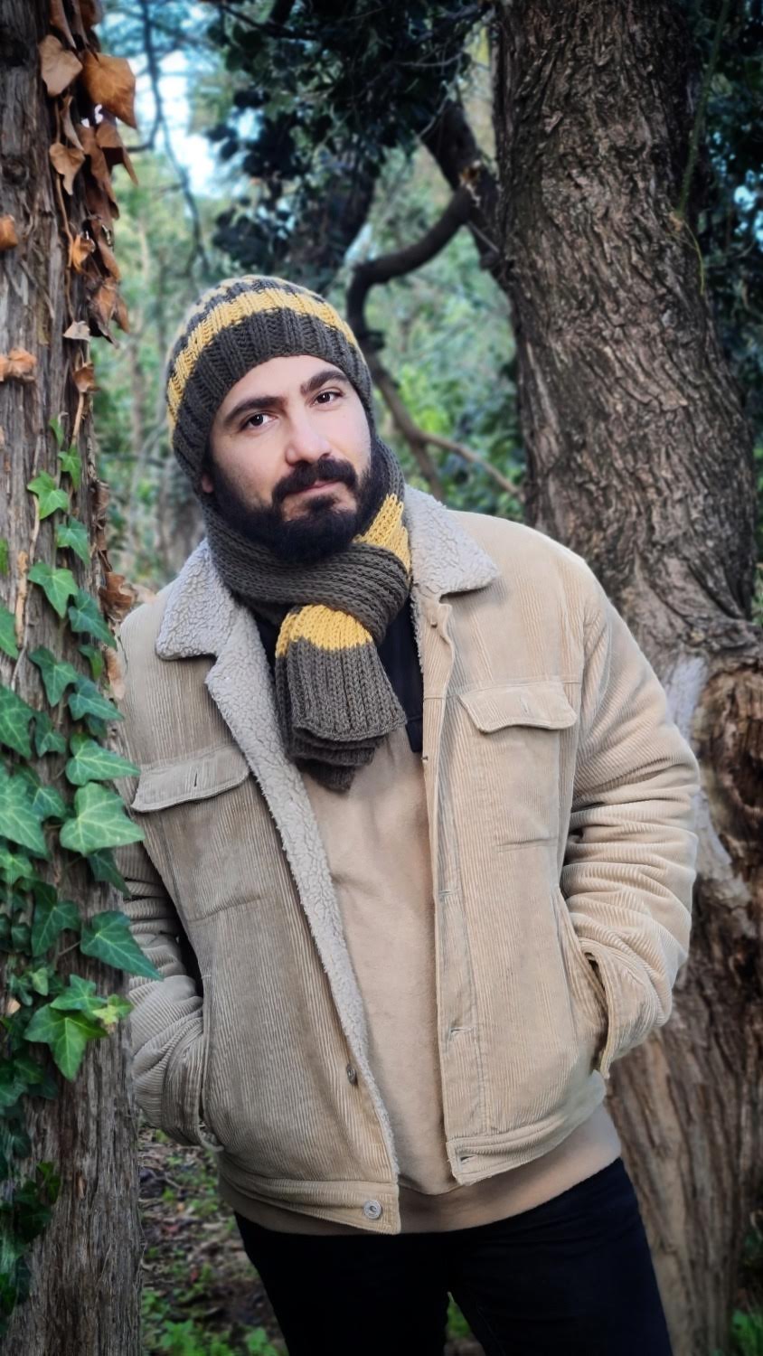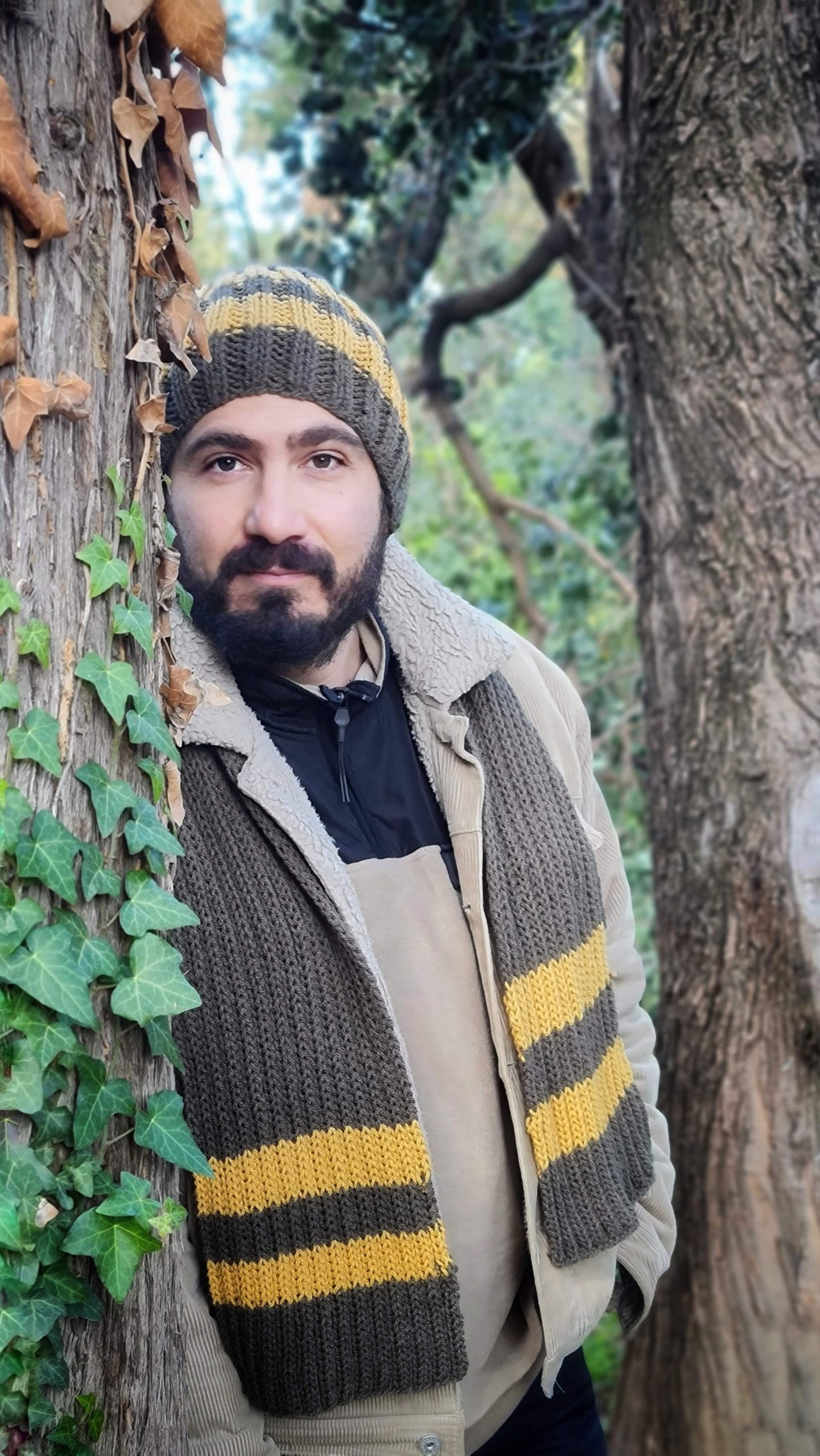 Χειροποίητο μάλλινο κασκόλ σε Χακί χρώμα με κίτρινες λεπτομέρειες στα άκρα!